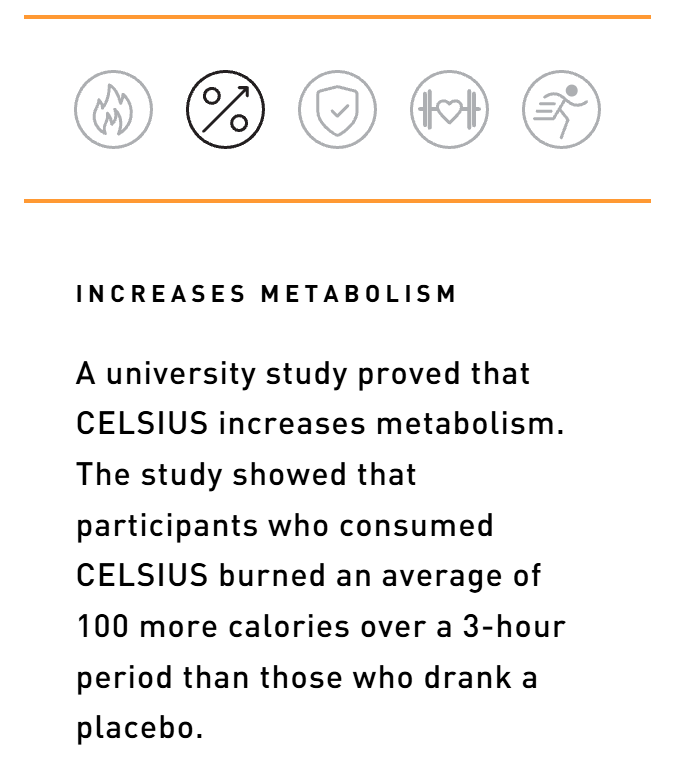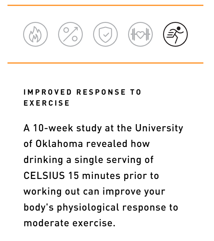 Stay active and energized all day long with CELSIUS by your side. We’re different from other energy drinks because we focus on movement. When combined with exercise, our formula is clinically proven to boost your metabolism and help you burn body fat. Whether you need an extra boost at the gym or a delicious pick-me-up to help you hustle through your workday, CELSIUS is here to help you stay active and focused on your goals. Made with only the best ingredients, CELSIUS has no artificial preservatives or flavors, no aspartame or high fructose corn syrup, and it’s very low in sodium..